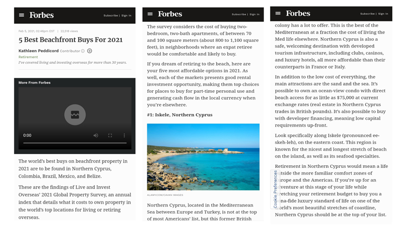 On February 5, 2021, American Forbes magazine, which is one of the most prestigious magazines in the field of finance and investment in the world, published an article titled “Top 5 places in the world to buy beach property”. As it is known, the title of this article is very heavy and on the other hand, it has a high attraction for the audience, and it is interesting to let you know that the first place in this classification was the city of the North Cyprus Seafront. This issue alone caused the price of property in this area to increase at that time.